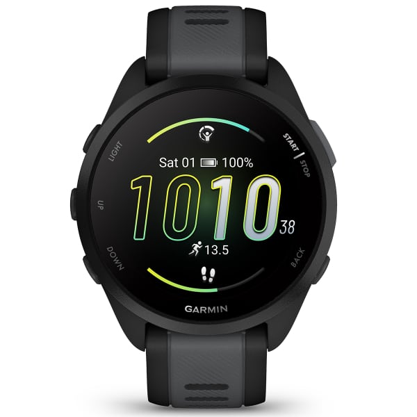The lightweight FORERUNNER 165 watch from Garmin adds rhythm to all your runs.
